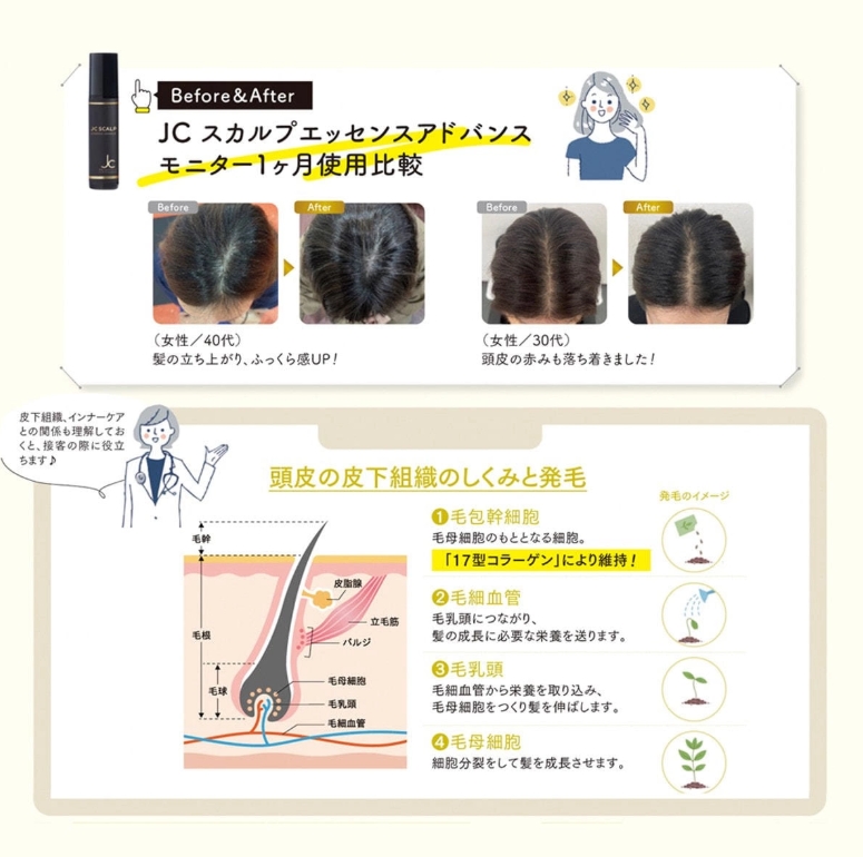 ヒト幹細胞培養液やピディオキシジルなどの既存成分に加え、 「17型コラーゲン産生促進成分」 を新配合。