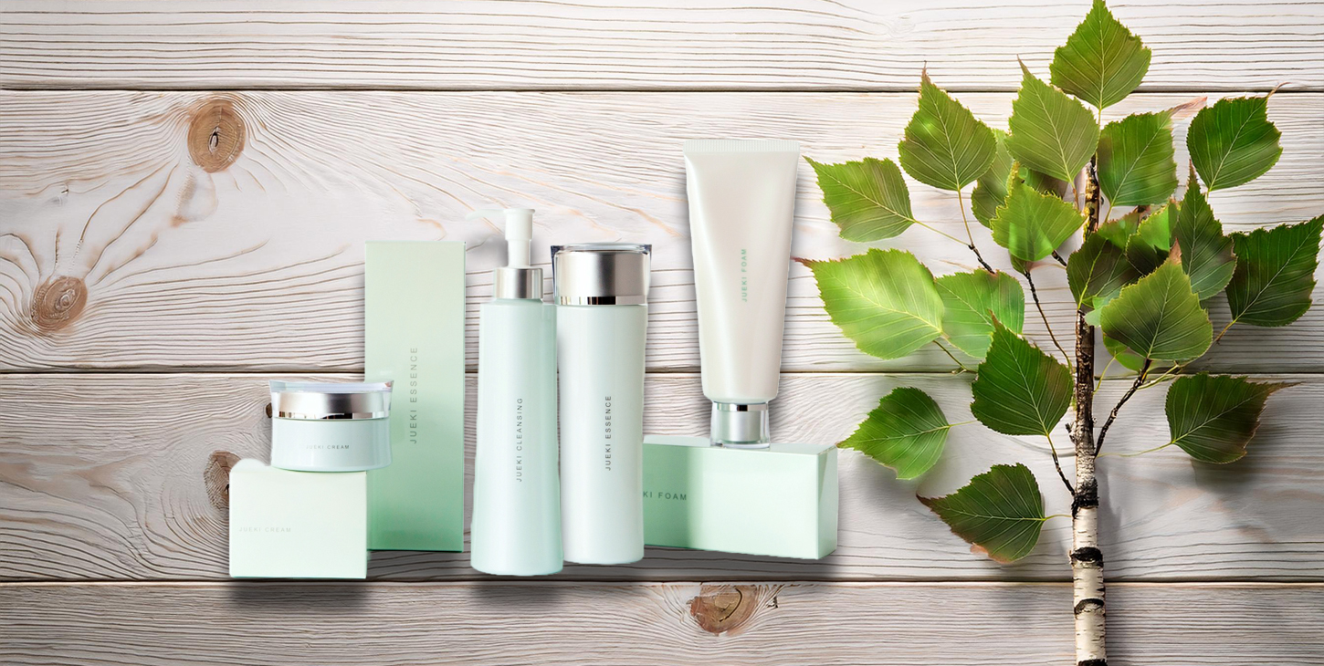 化粧品のベースとなる「水」は一滴も使わず、白樺樹液100%に代えたJUEKIシリーズは 北欧に自生する白樺から採取した樹液を贅沢に使用したスキンケア製品です。
